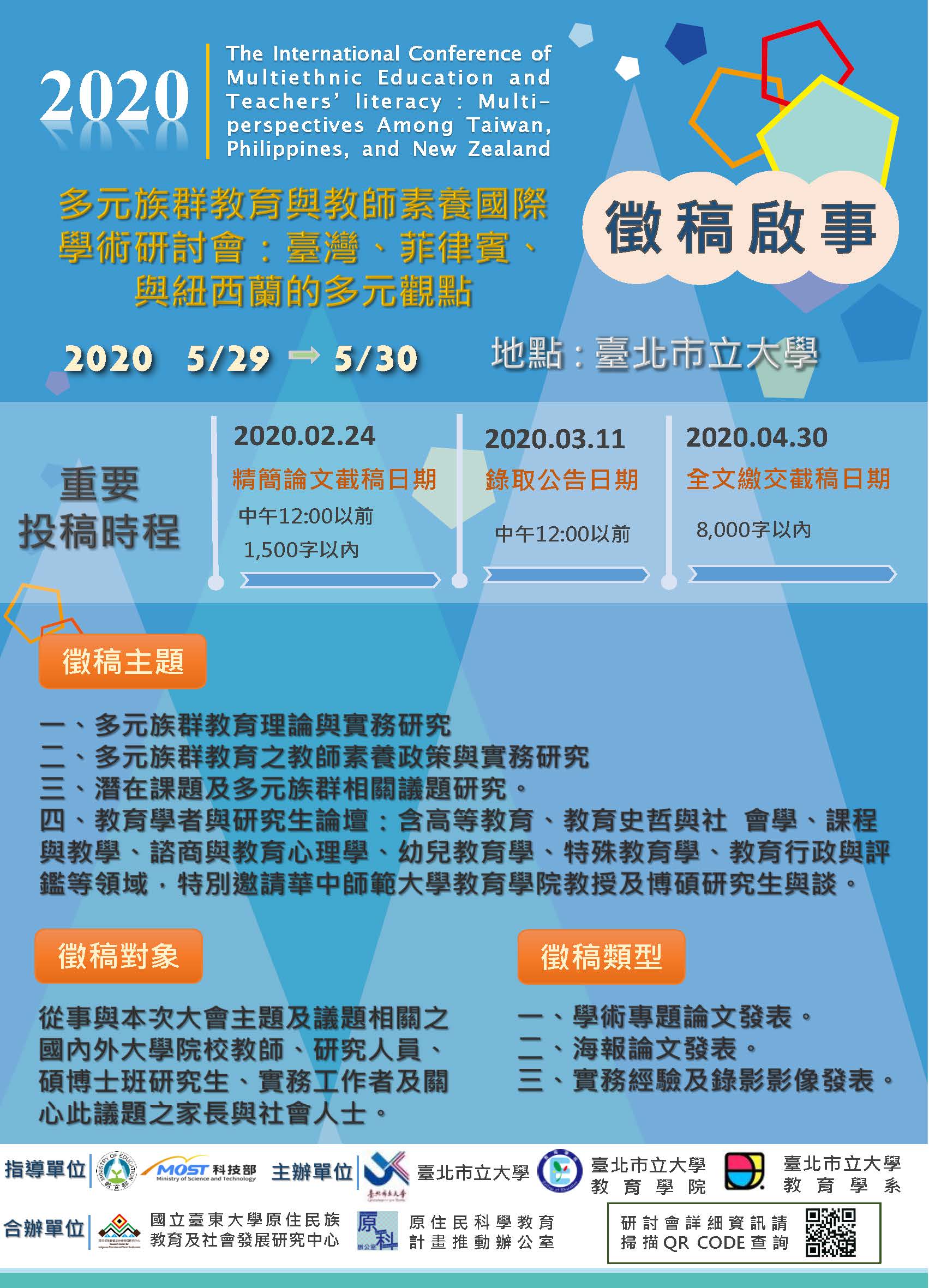 2020.02.05【活動訊息】臺北市立大學「2020多元族群教育與教師素養國際學術研討會」徵稿訊息